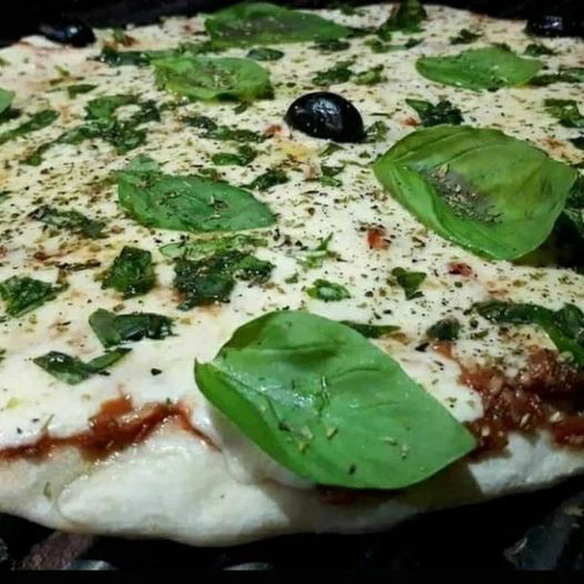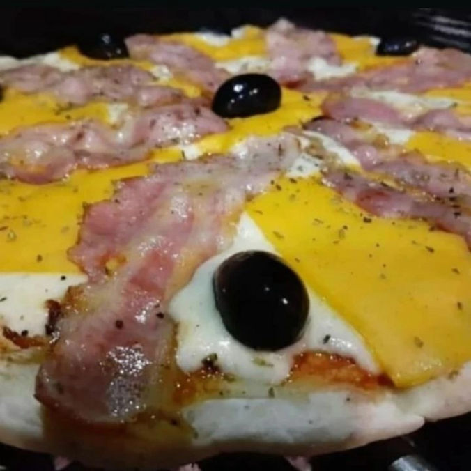 - Muzzarella, salsa de tomate cheddar, panceta y aceitunas negras
